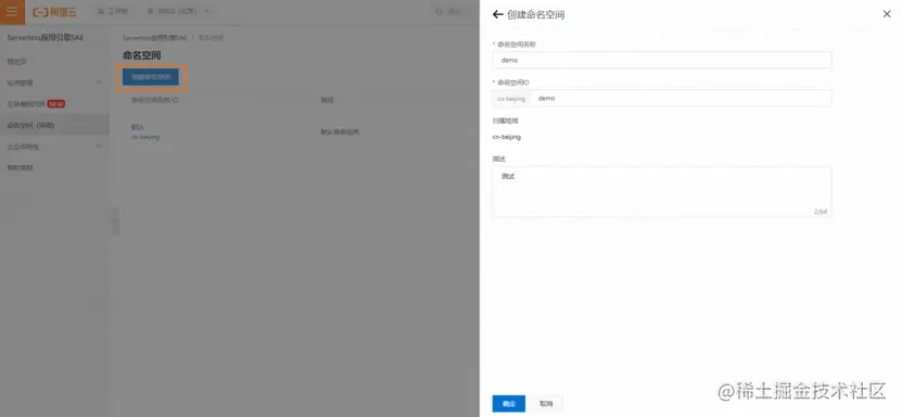 | 命名空间 ID | 自定义,例如输入 demo。 |