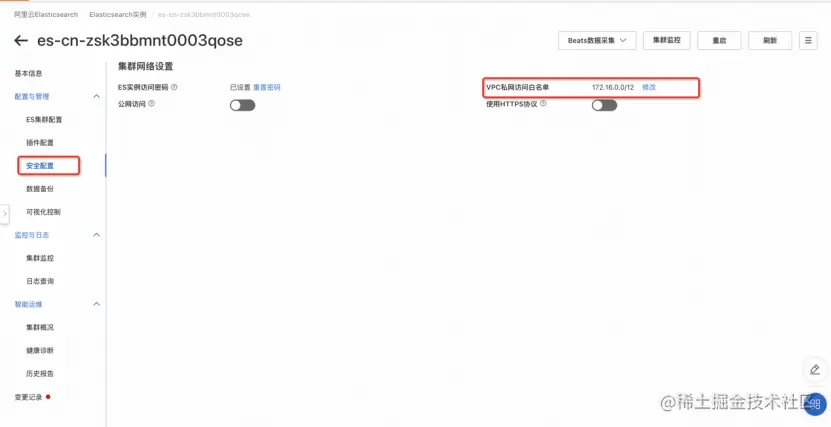 3. 进入安全配置,确认 VPC 私网访问白名单是否包含 ES 实例所在的专有网络的全部网段: