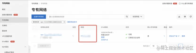 专有网络网段可以进入专有网络列表页查看:阿里云登录 - 欢迎登录阿里云,安全稳定的云计算服务平台