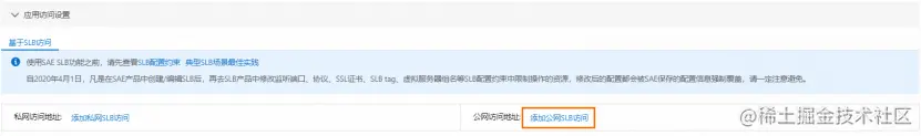 - 在应用的基本信息页面的应用访问设置区域,单击添加公网 SLB 访问。