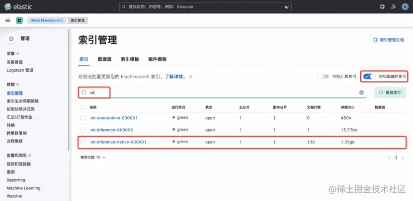 左侧菜单栏 “Management” 进入 “Stack Management”的“ 索引管理”模块,确认 “image-embeddings” 和 ".ml-inference-native-000001" 大小和下图一致: