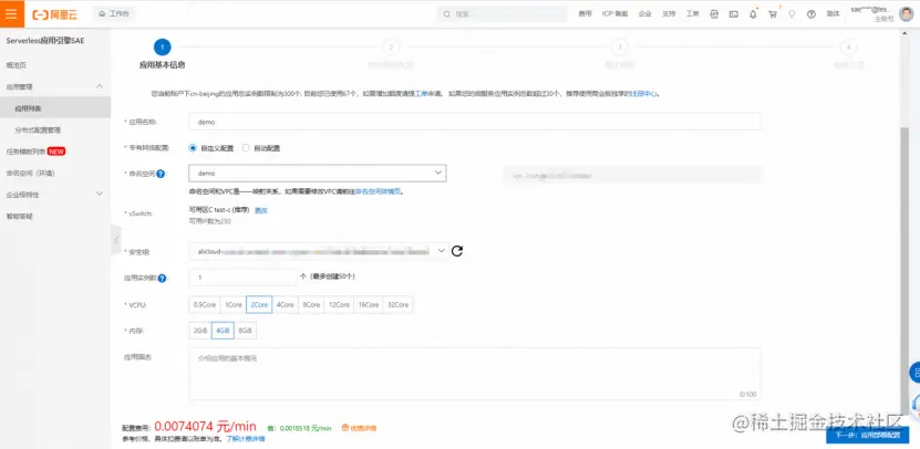- 在应用部署配置配置向导,配置相关信息,然后单击下一步:确认规格。