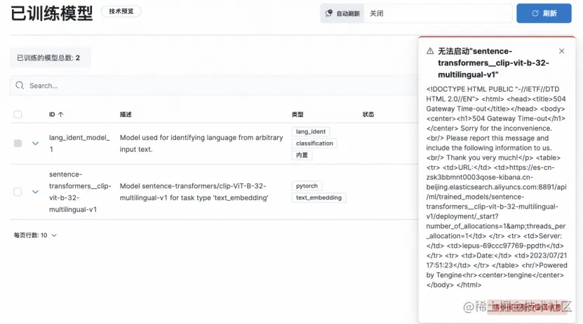 **tips:**如遇以下网络返回超时报错可忽略,关闭报错窗口并刷新,模型状态能正常更新为 “started” 即可。