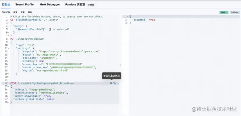 - 通过快照恢复方式将数据集和模型导入到 ES 实验实例中: