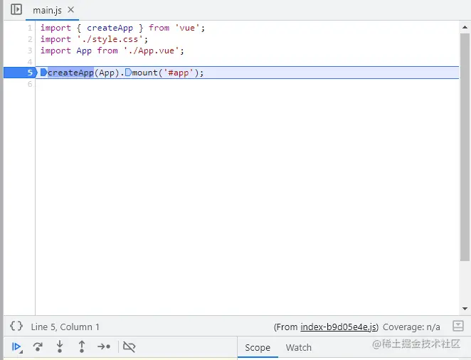 在浏览器里面我们把断点打到main.js的createApp那行,断点生效后点击step into(图1左下角)跳进函数声明,可以看到图2以及正确跳进了vue3的源码的createApp函数声明里面