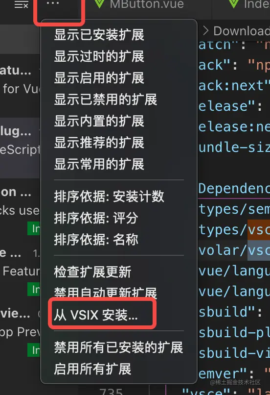 2. 使用控制台打开extension文件,并运行vsce package,运行之后会在extension文件下生成一个vsix文件, 在vscode中从vsix安装