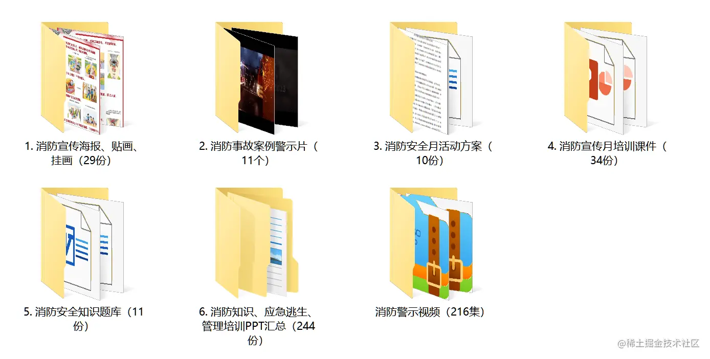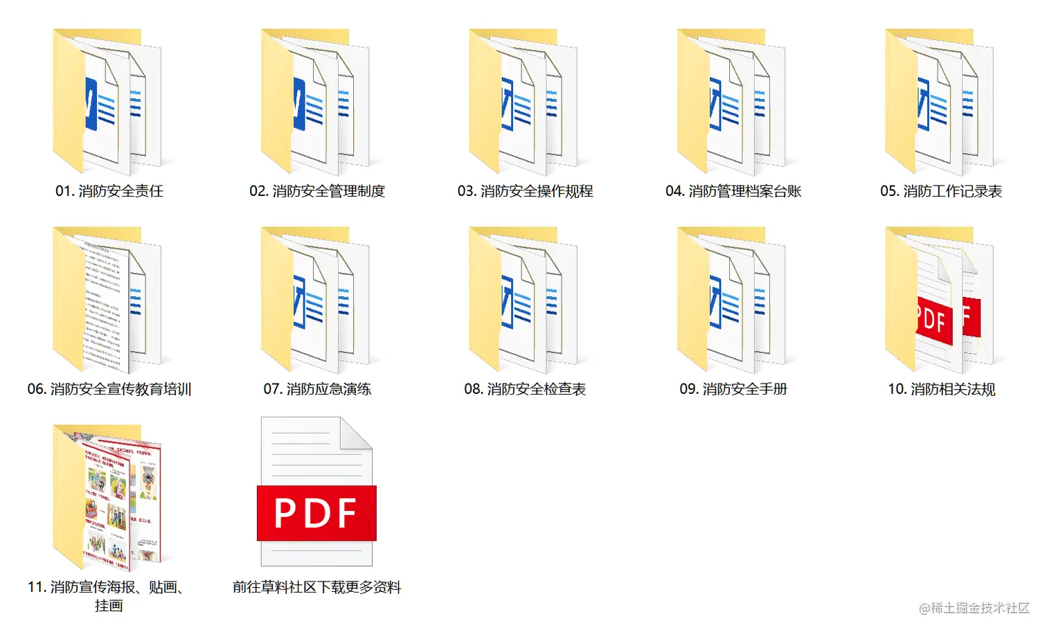 资料共11大模块,272份精华干货,涵盖了消防安全责任、消防安全管理制度、消防安全操作规程、管理档案台账、消防工作记录表、消防安全宣传教育培训,消防应急演练、消防安全检查表等多个方面,供大家免费下载学习使用。