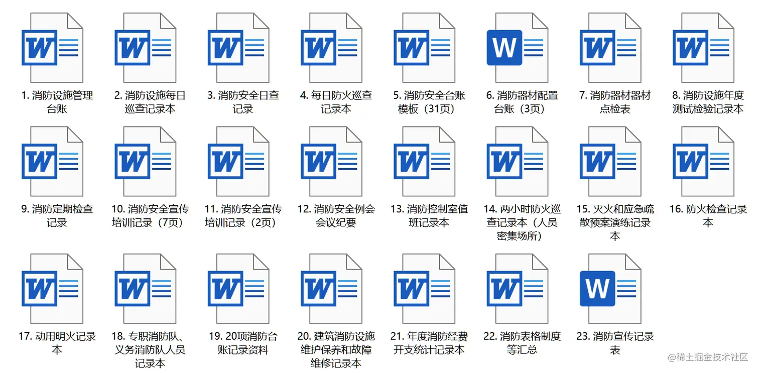 包含了消防设施巡检、消防器材日检、月检、季度检查,安全教育培训记录,消防控制室值班、交接班记录,以及防火检查、应急演练记录等23份记录表范本。