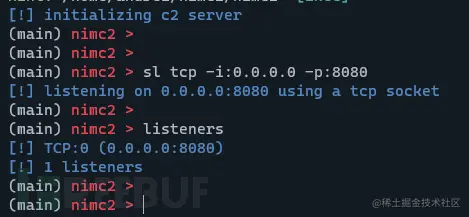 nimc2服务器端基于命令行接口实现其功能,我们可以在查看到“(main) nimc2 >”提示后输入想要执行的命令即可。