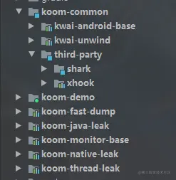 - koom-common : 公共库,主要包括 kwai-android-base(基本的工具类,常见的调用函数等)、kwai-unwind(栈回溯相关的工具类)、third-party(分别是 shark(用于分析内存快照hprof) 和 xhook(用于 hook));
