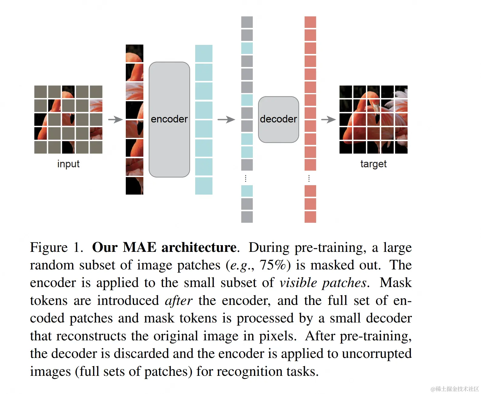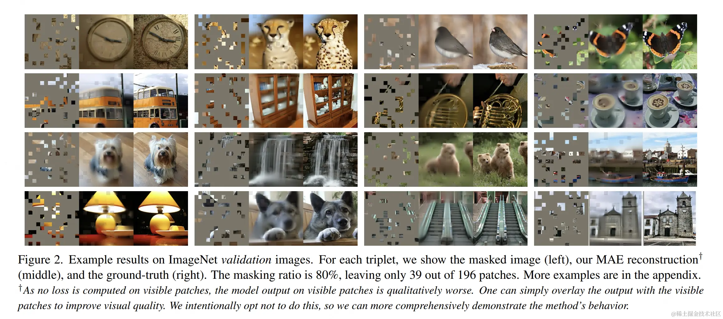 那么,既然VIT的能力如此之强,只用它来验证分类任务,是不是太浪费了?我能再给它上点难度吗?比如,我把图像随机遮盖掉一部分,让它做像素级别的图像重建?