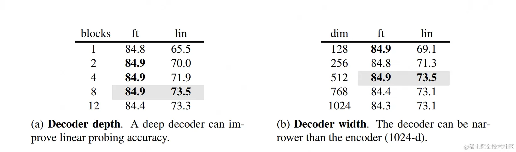 在这个实验中,作者将decoder的深度和宽度都作为变量,做了一系列实验。从中我们还是可以看出,随着decoder模型复杂度的上升,fine-tuning和linear probing的效果也是越好,但复杂度超过某一阈值时,微调的效果不升反降。
