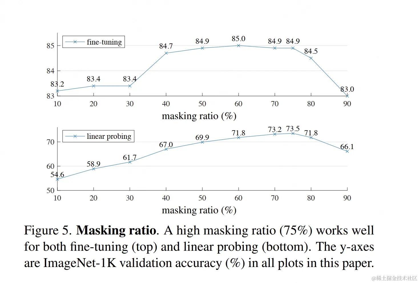 从从这个实验结果上看,不管是fine-tuning还是linear probing,微调效果都呈现出随着mask比例增加而上升的趋势,但mask比例超过一定数值时,整体效果呈下降趋势(难度上过头了)。
