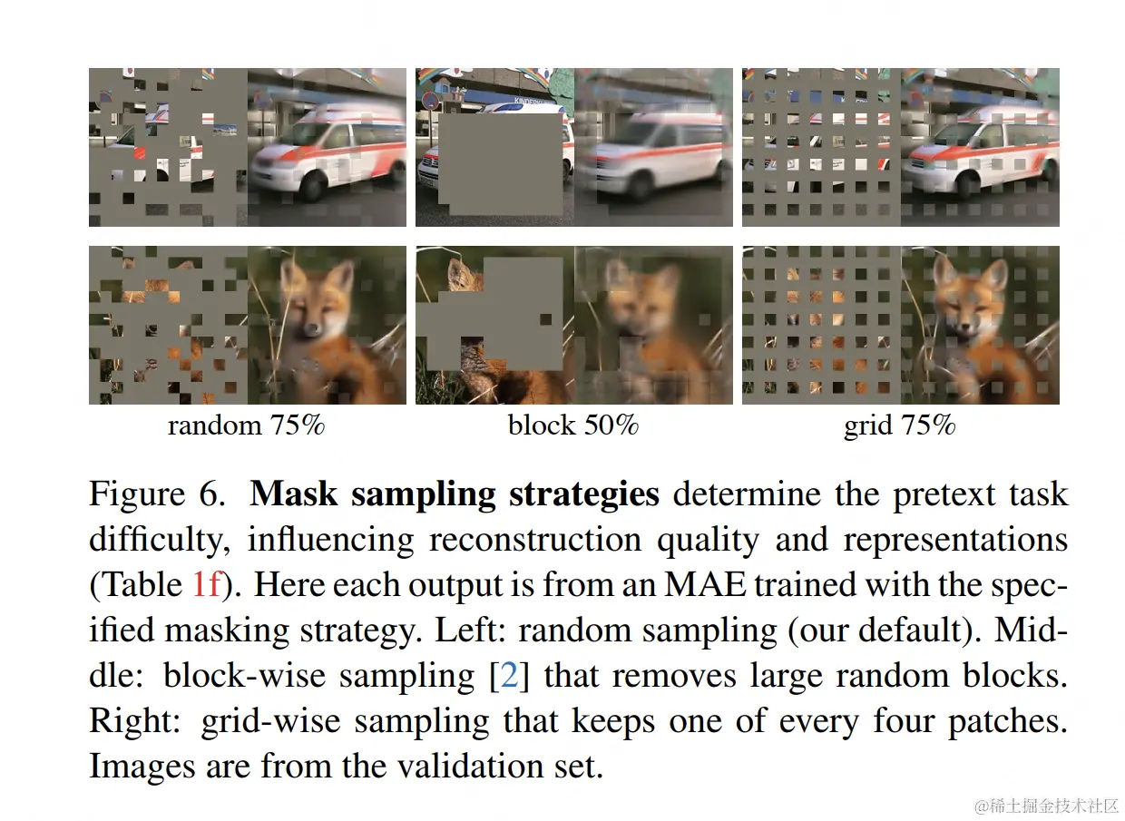 在这一方法中,作者在图片中选择了一片连续性区域,对这片区域中的patch做mask(因为这项实验侧重在“连续性”上,只要连续性块足够大就能达到实验目的,所以这里选择的mask比例是50%)。可以发现,此时MAE图像重建能力是最差的。