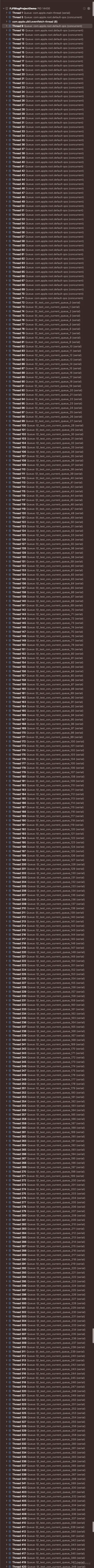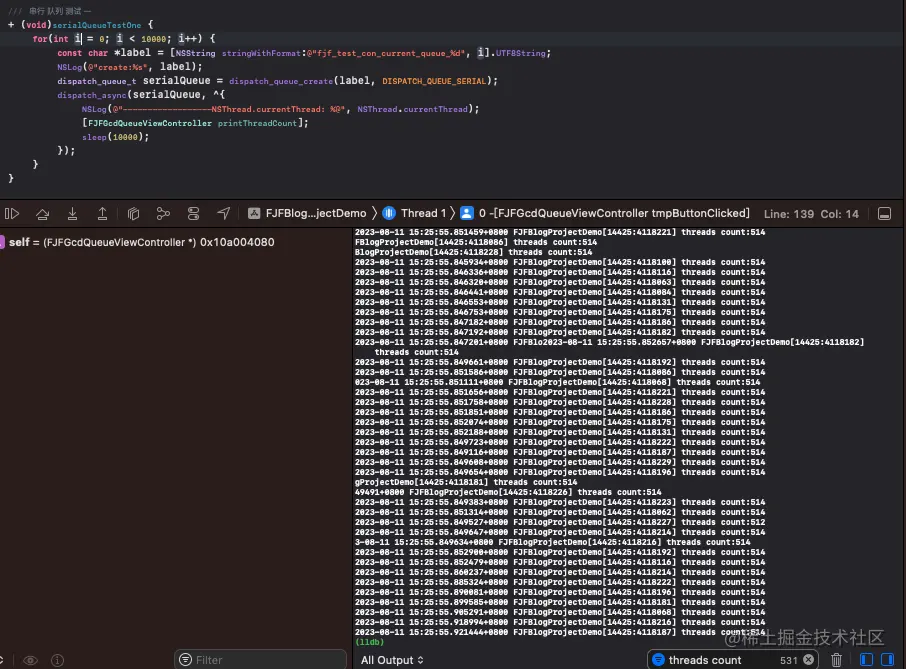 从Xcode的线程分布也可以看出属于GCD的fjf_test_con_current_queue_XXX (serial)串行队列的线程数量最多512条。