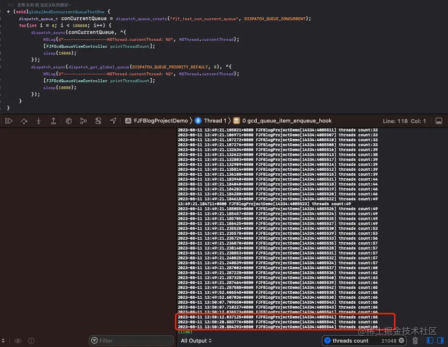 从日志打印我们可以看到即使自定义的并发队列和全局并发队列一起调用,可以创建最大的线程数量是66条线程。