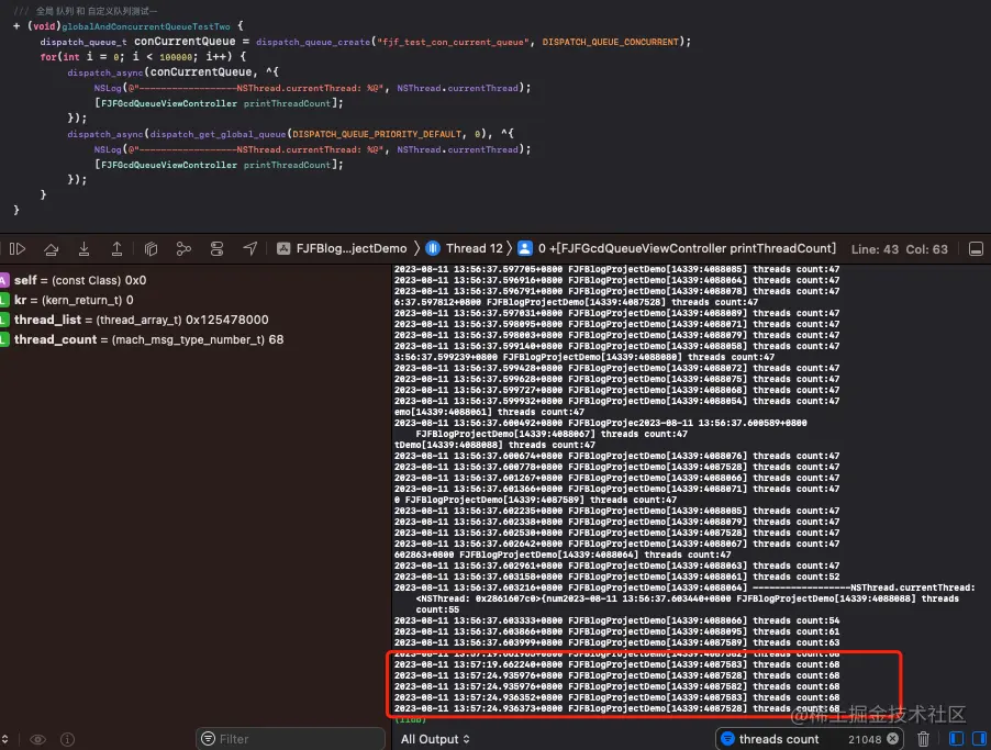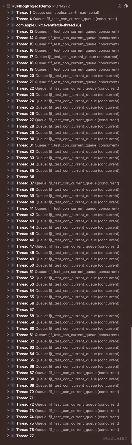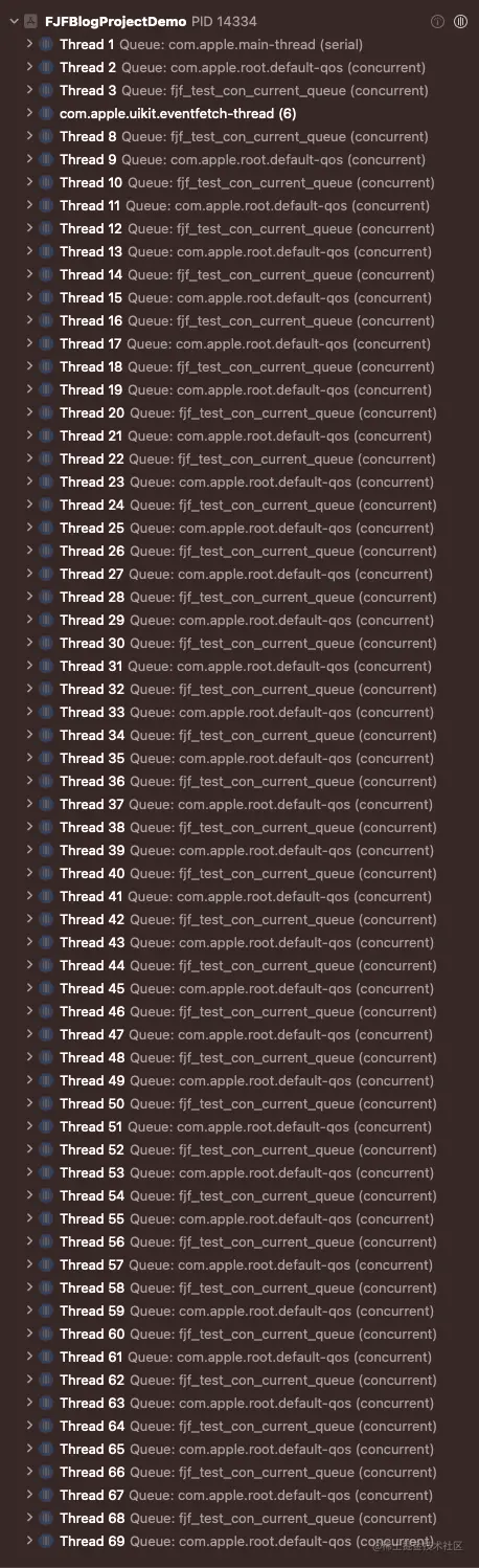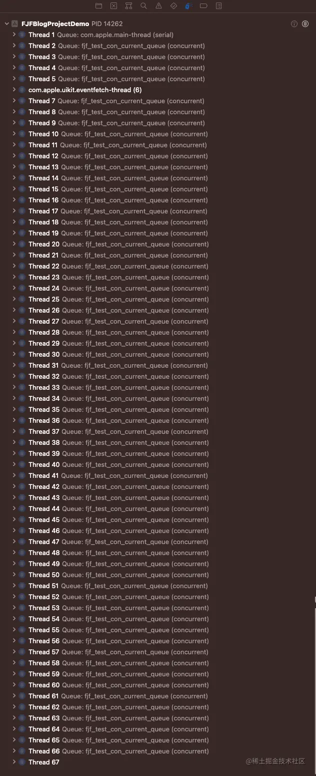 从Xcode的线程分布也可以看出属于GCD的fjf_test_con_current_queue(concurrent)队列的线程数量也是总共64条。