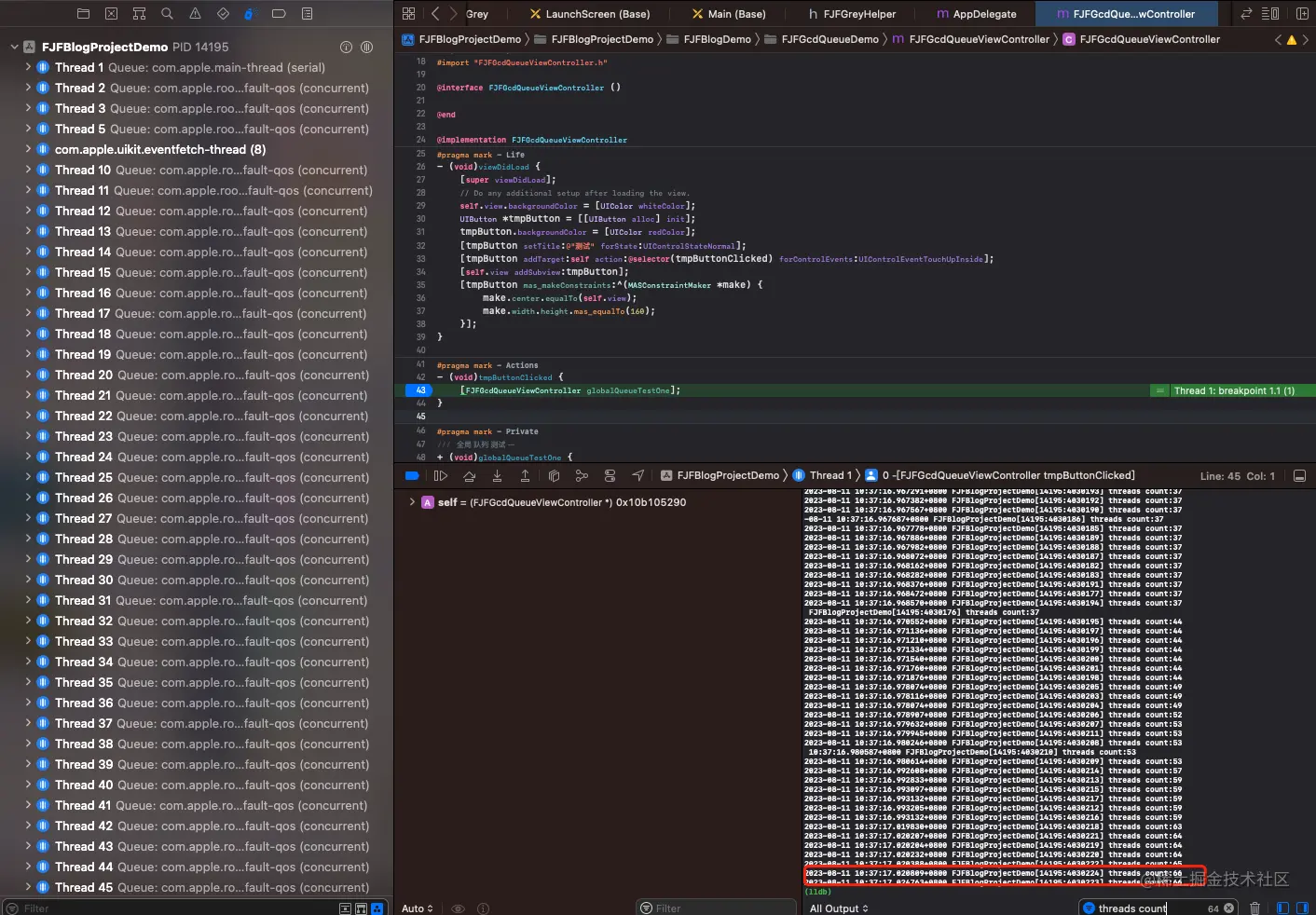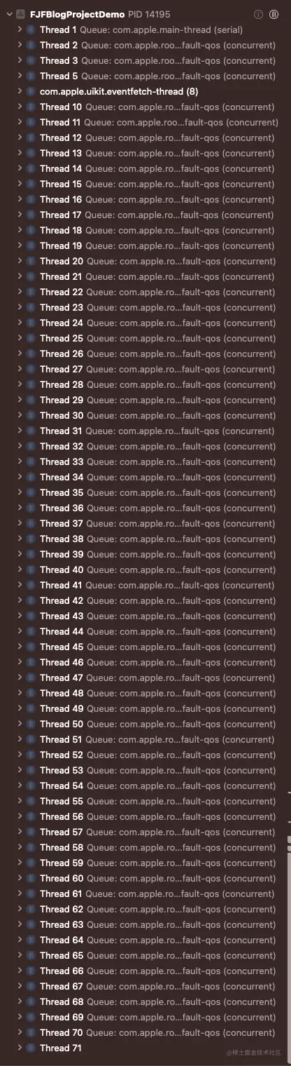 从Xcode的线程分布也可以看出属于GCD的fjf_test_con_current_queue(concurrent)队列和com.apple.root.default-qos (concurrent)的线程数量也是总共64条。