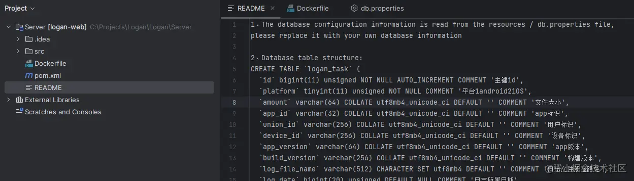 根据Logan项目中Server/README文件,进行数据库创建(DBeaver - SQL编辑器 - 新建SQL编辑器),在SQL编辑器中输入上SQL创建的命令: