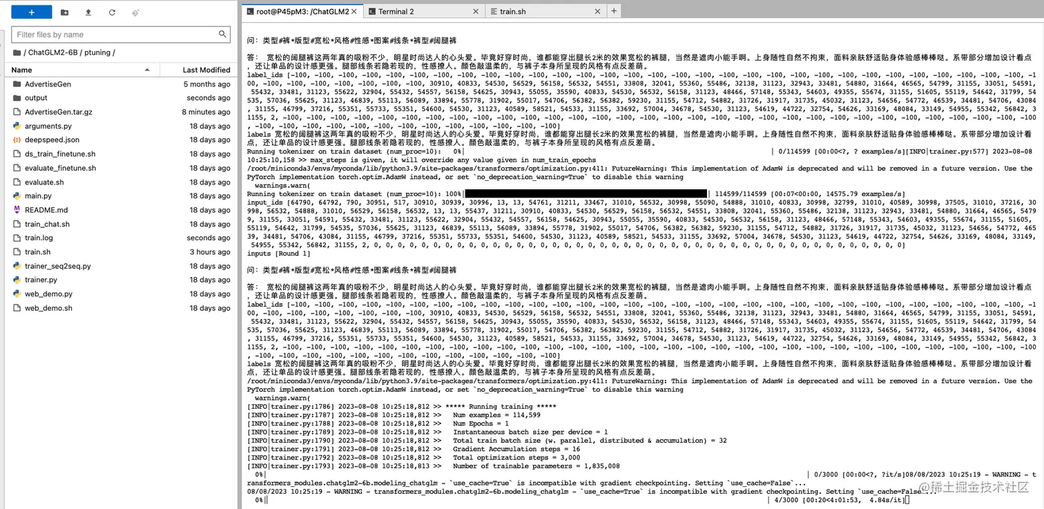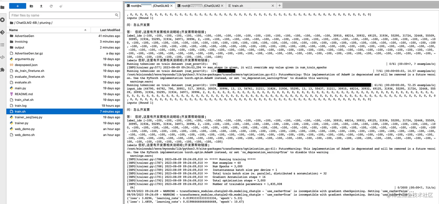 训练完成后,所有输出会存放在/ChatGLM2-6B/ptuning/output目录下,包括训练保存的模型和运行日志、其他结果数据。