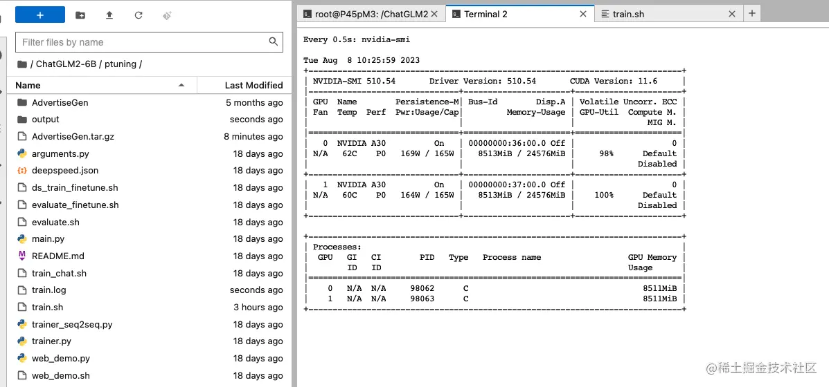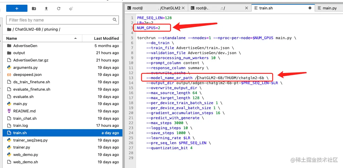 打开/ChatGLM2-6B/ptuning/train.sh文件,因为我们租用的是2卡 A30,所以将NUM_GPUS设置成2即可,其余路径默认设置即可。(数据集路径是官方代码设置好的,使用AdvertiseGen数据集时不需要修改,使用自己数据集请改成对应数据集目录)
