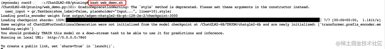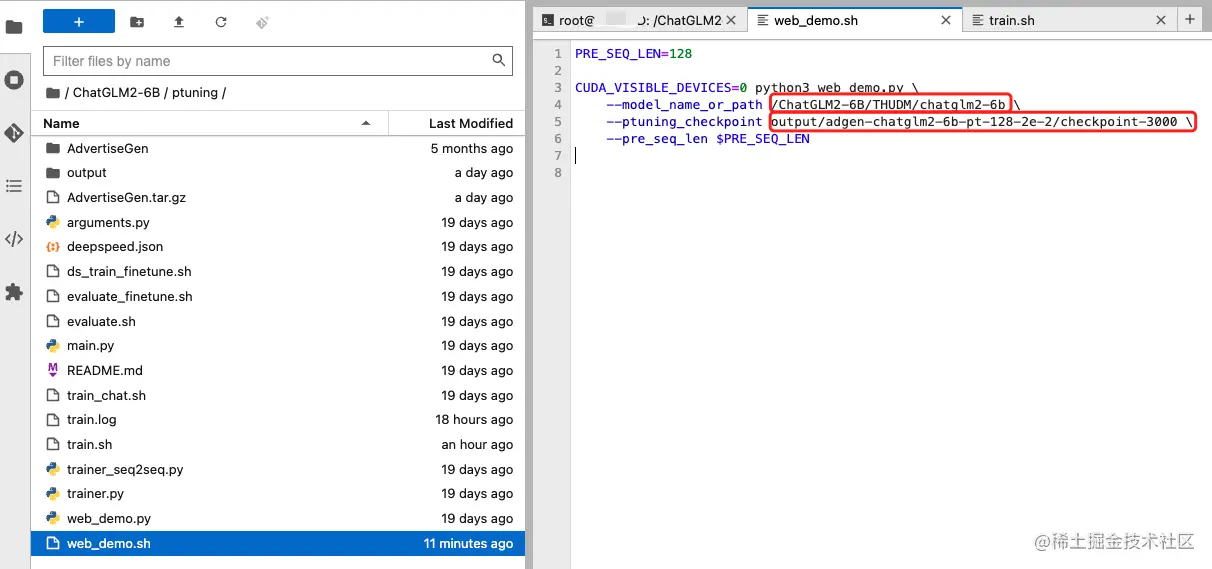 官方提供了一个脚本web_demo.sh,我们打开这个文件,只需要修改下model_name_or_path和ptuning_checkpoint即可。
