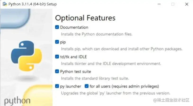 如果你是选择Install Now那么点击之后,程序会帮你安装好。如果是手动安装的话,那你会进入第二步,全部勾选上,这些基本都是python开发的工具,有文档,有安装包的工具,这里也有介绍,大家可以翻译过来,仔细端详。