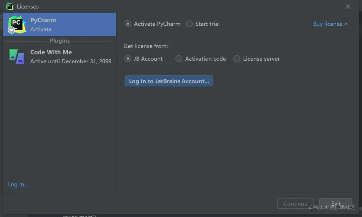 Pycharm 运行成功后,会弹出如下对号框,强制用户需要先登录 JetBrains 账户才能使用: