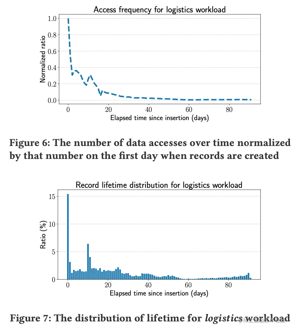 archival write and point read intensive (AWPI) 是 LSM-tree 非常常用的一类 workload,简而言之就是越早 insert 的数据一般来说被访问到的概率越低,并且查询主要以 OLTP 的点查为主。如图,logistics 负载中差不多 15% 的访问数据都是当日被插入的数据。