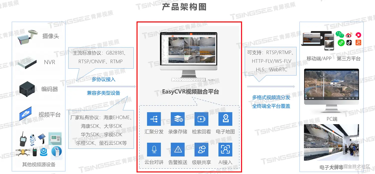 安防视频监控平台视频集中存储EasyCVR可拓展性强、视频能力灵活、部署轻快,可支持的主流标准协议有国标GB28181、RTSP/Onvif、RTMP等,以及支持厂家私有协议与SDK接入,包括海康Ehome、海大宇等设备的SDK等。