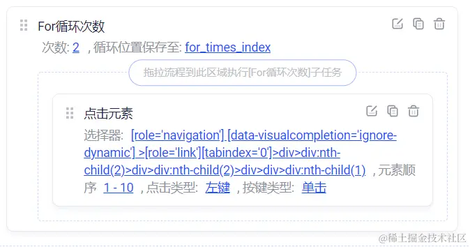 这个步骤主要用来完成一种场景,比如你想点几个赞,点几次某个按钮等等。只要是重复操作几次一样的步骤,那么就可以用【For循环次数】。 同时,还可以帮你节约“RPA点数”哦。