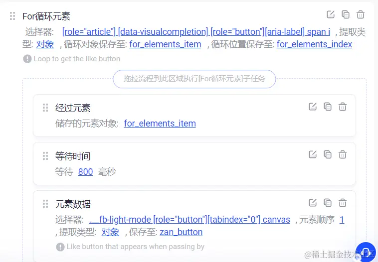 当要在页面里循环一系列网页元素,比如标题,图片,按钮,文章等,每循环一个元素,就做同一样的动作。例如,FB主页里,每个帖子都有“赞”这个按钮。我们可以利用【For循环元素】去循环每一个赞,然后依次点赞。当你希望依次对网页的相似元素进行判断或做某些动作的时候,可以考虑使用【For循环元素】