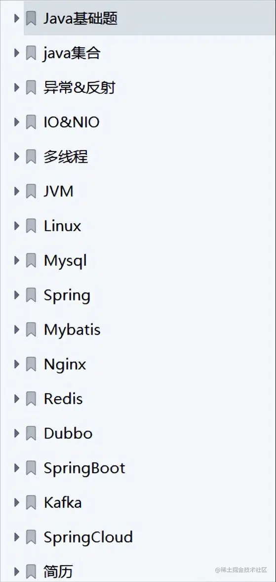 此专题总共包含17个专题,Java基础题,java集合,异常&反射,lO&NIO,多线程,JVM,Linux,Mysql,Spring,Mybatis,Nginx,Redis,Dubbo,SpringBoot,Kafka,SpringCloud,最后是简历!