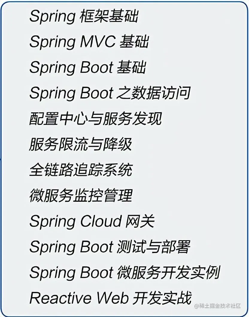 目录总共分为12章,Spring 框架基础、Spring MVC基础和 Spring Boot 基础都是针对初学者的,主要起到一个前置知识的作用,不同水平的小伙伴完全可以根据自己的情况来选择对应的章节进行学习