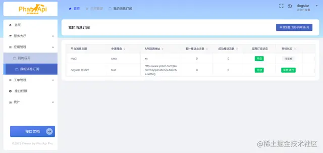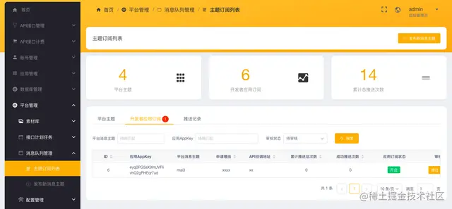使用管理员账号,可以在Admin管理后台 - 平台管理 - 消息队列管理,发布新的消息主题并进行管理。同时对新申请的应用订阅进行审核、查看、推送成功次数和总次数的统计,以及详细的推送结果记录。