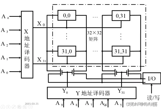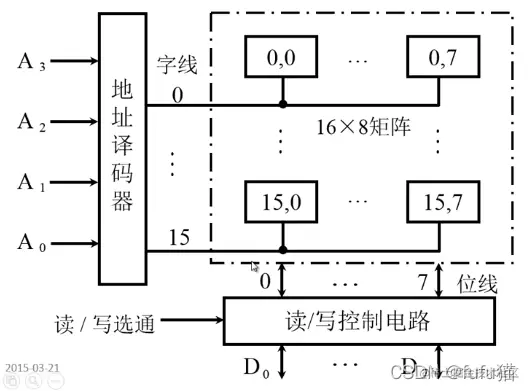 地址线经过地址译码器转化为相对二级制对应的子线,每次选择一根子线上的所有位进行输出与写入。