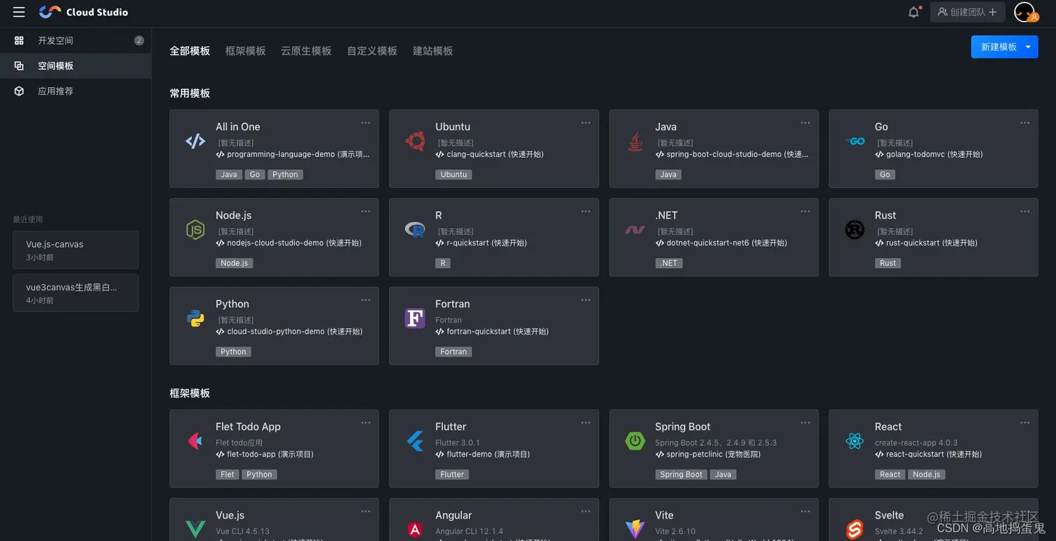 当然, Cloud Studio 提供了茫茫多的模板,我们可以不创建工作空间,而是从中选择自己熟练的技术栈打开也可以的。