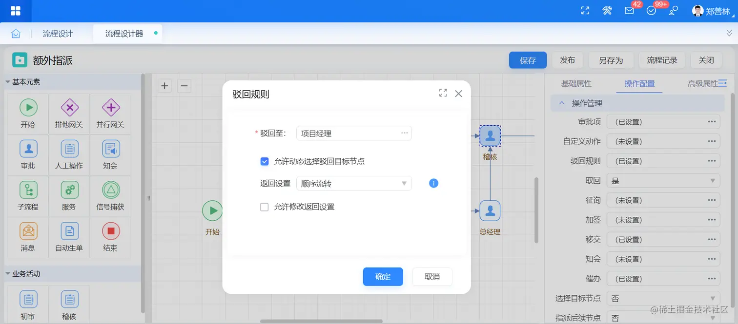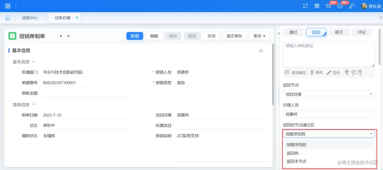 此外,流程管理员不仅可以在设置驳回规则时指定返回设置的效果,也可以将选择权赋予驳回人,驳回规则中勾选返回设置后,驳回人即可在驳回时动态选择返回设置。