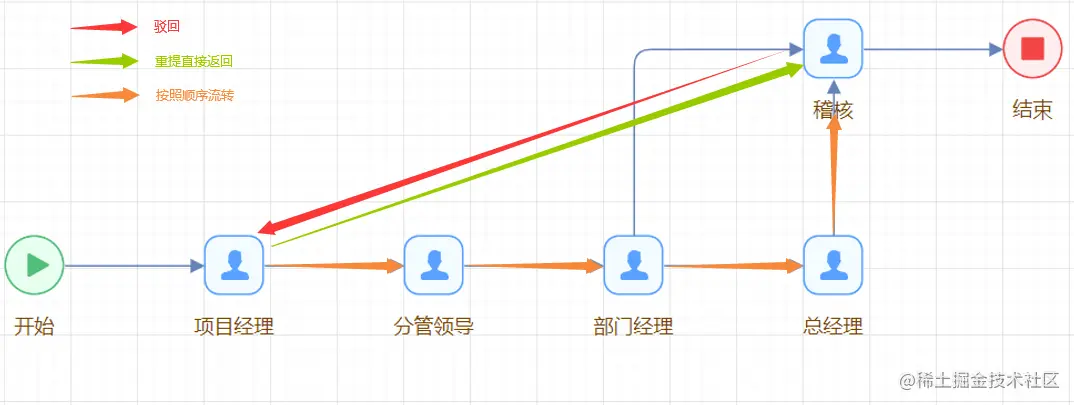 在工作流场景中,由审批人动态的选择要驳回的目标节点及驳回后重新提交的流转效果的驳回就叫做动态驳回。动态驳回的支持力度也往往成为评价一个工作流引擎强弱的重要评价指标。