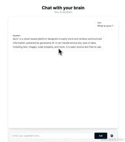 上传完成之后,进入聊天框,你就可以直接对AI进行提问了,Quivr会根据学习到的内容来回答您: