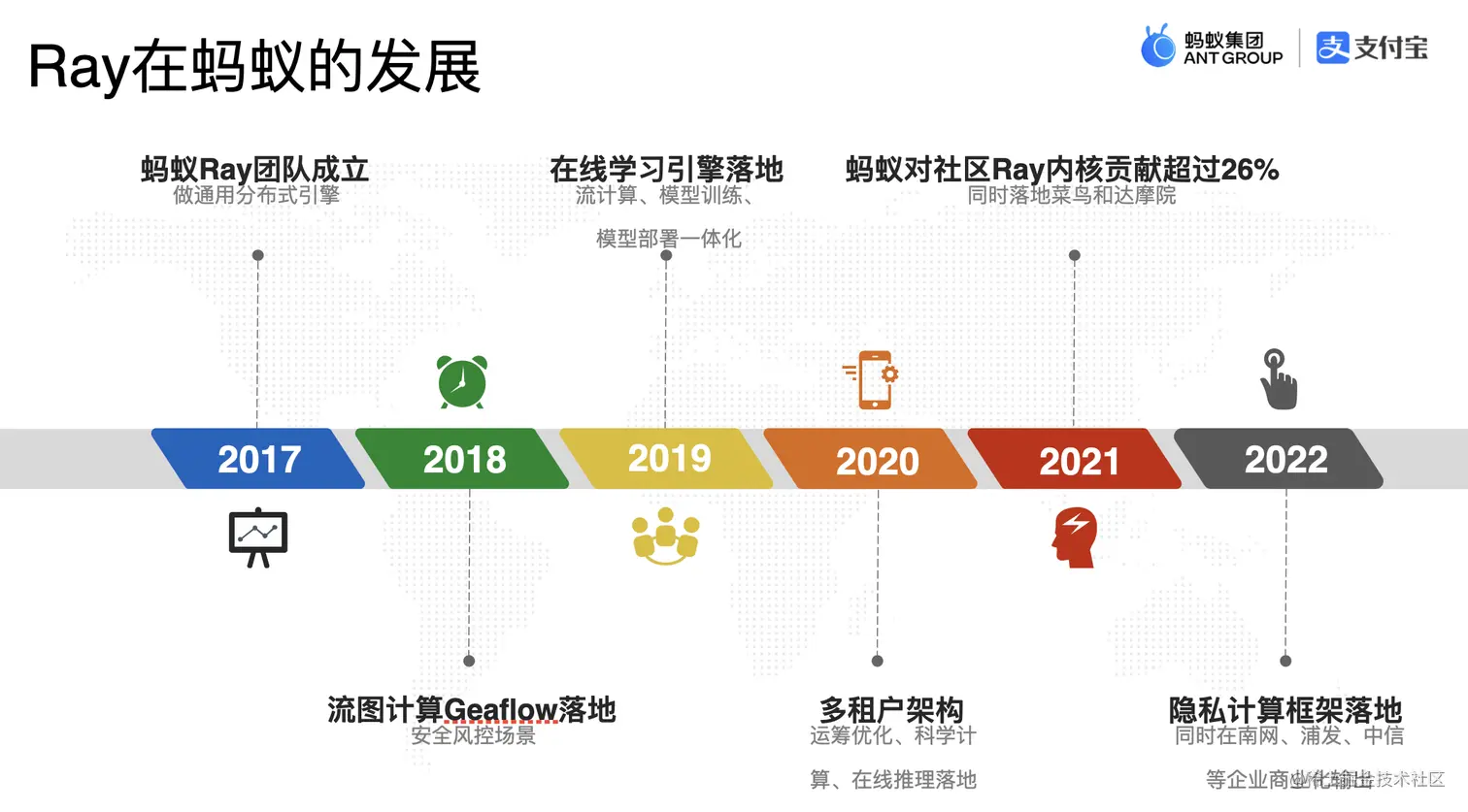从诞生到现在,Ray 经历了七年的发展,从一开始的强化学习方向到现在的AI方向,Ray 的团队及其开源社区也做了很多的努力,其中宋顾杨所在的蚂蚁集团从 2017 年就开始采用 Ray 框架作为支撑,并为 Ray 内核贡献了超过 26% 的代码,所以 Ray 框架其实在蚂蚁的各个场景内都有涉及,并且蚂蚁集团也为其发展也贡献了不小的力量: