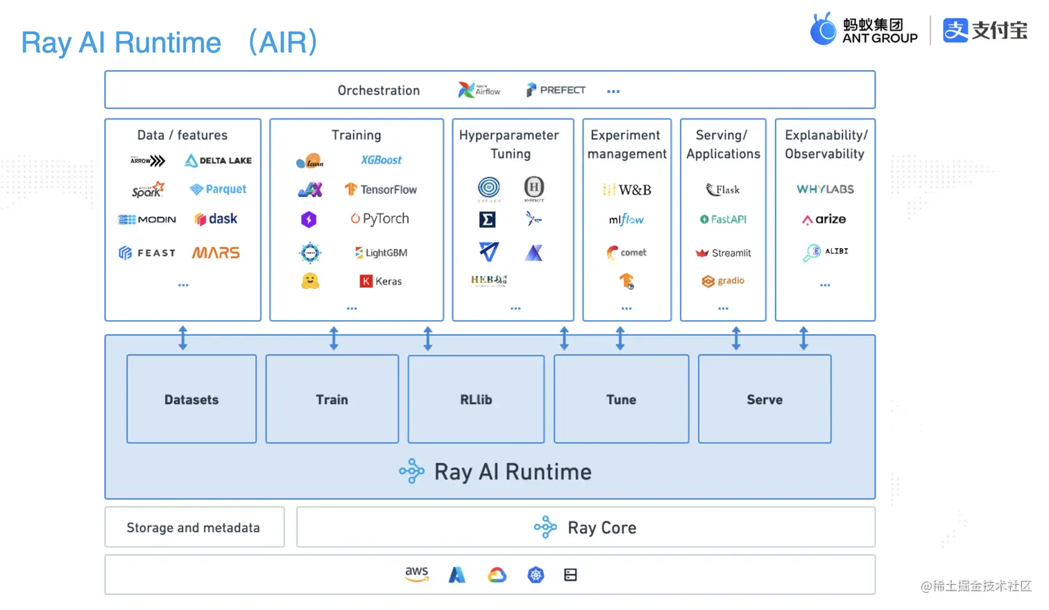 上图就是 Ray 支持的 AI 生态的全景图,几乎涵盖了市面上所有主流框架,也就是说,在 Ray 里面可以很方便的上面这些框架做集成。