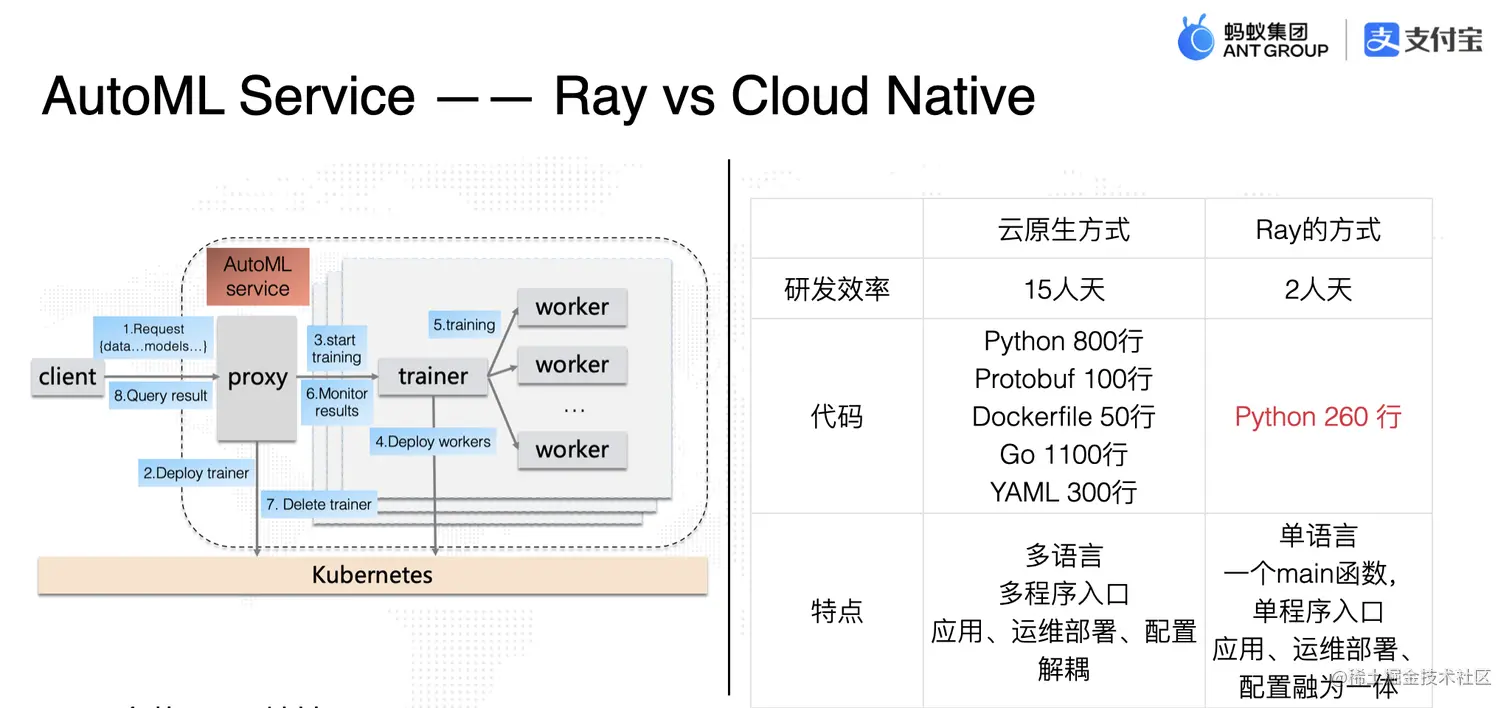 通过上面分享人给的例子图,可以看出 Ray 对于整个计算任务有很强的优化,无论是从效率还是功能上,都远远超过传统的云原生计算方式。