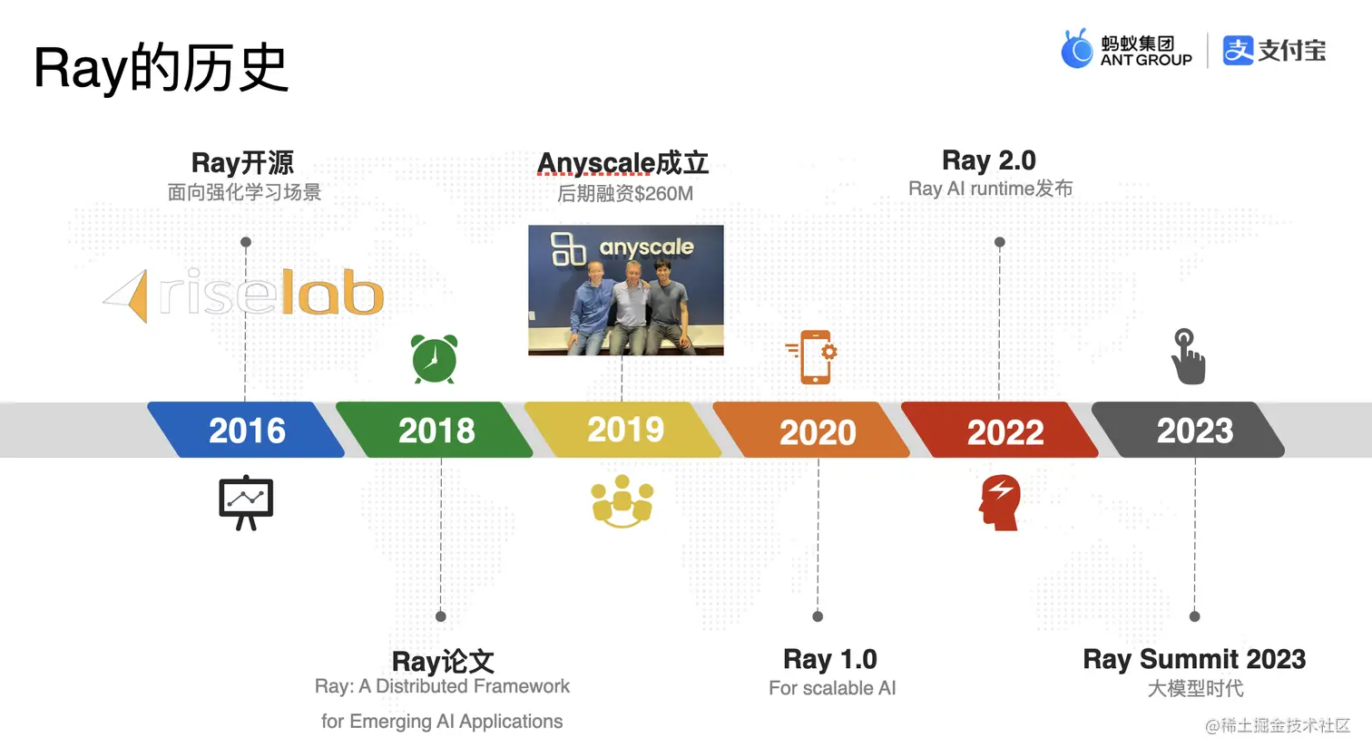 Ray 从诞生之初,其实是作为一款强化学习方面的框架被创造出来,随着时代的不断变化,Ray 也被加入了更多的功能,其定位也在慢慢发生改变,先来看一下 Ray 的发展历程: