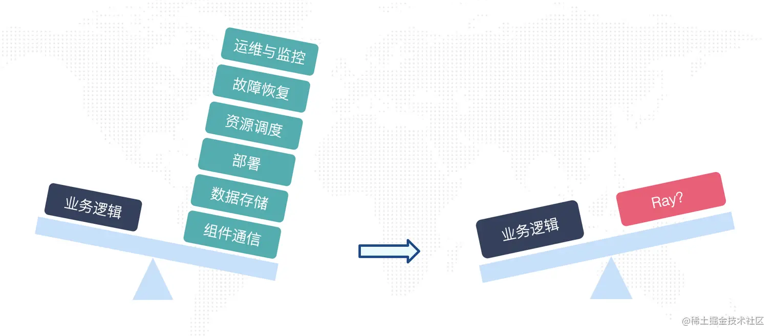 对于任何一个分布式系统研发团队来讲,他们会面临一些很重复的问题,就是上图右边的这些问题,这些问题会耗费整个研发团队很多不必要的经历,Ray 来解决的就是这么一个问题,让研发团队更专注于自身的业务系统上而非通用问题上。
