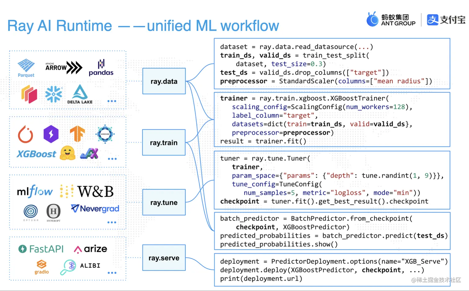 通过这些框架集成,Ray 也可以将整个AI pipeline执行过程串联成以下四个大步骤: