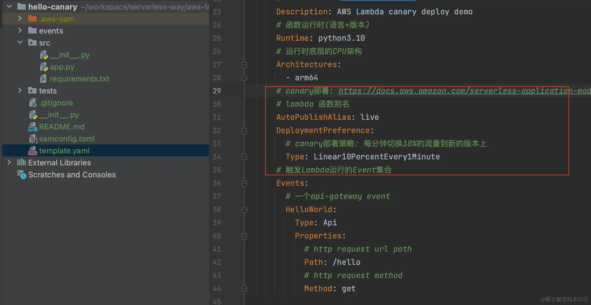 从原理上讲,aws lambda的金丝雀发布是基于aws codedeploy来实现的,流量滚动由codedeploy来逐渐的自动调整,当有故障时马上回滚,没故障继续增加新版本的流量占比。