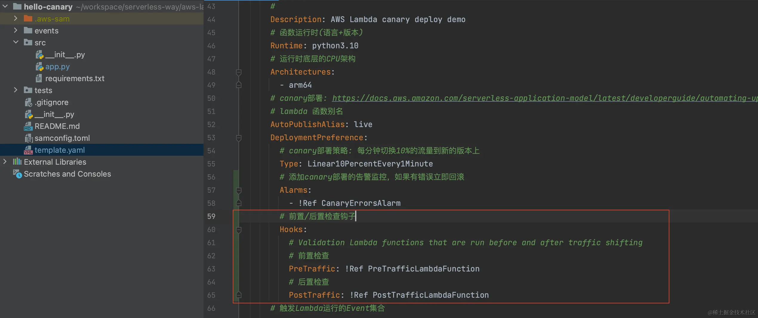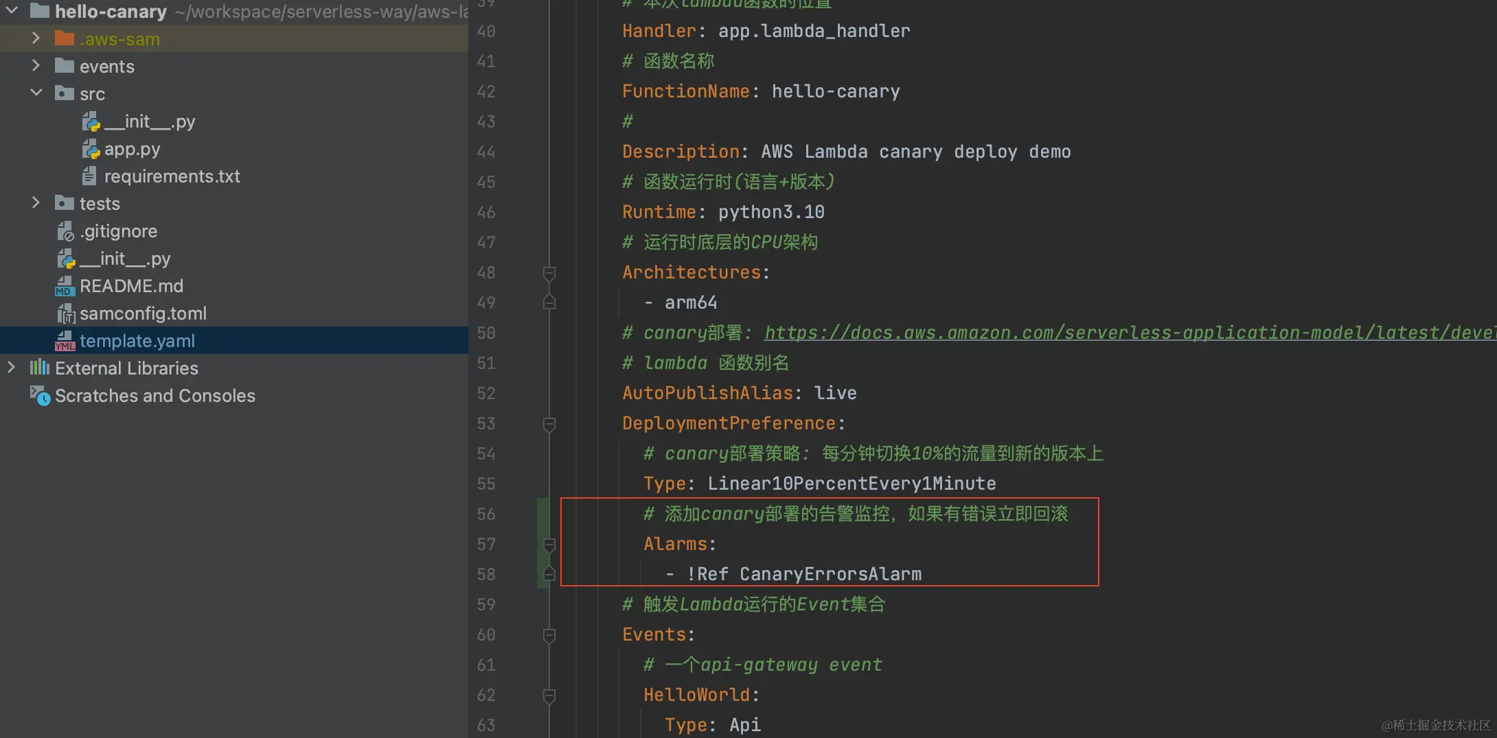 然后引用这个告警,告诉aws sam框架:在遇到告警的时候闪回到旧版本