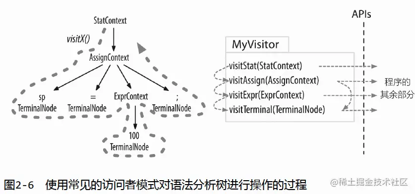 其中,粗虚线显示了对语法分析树进行深度优先遍历的过程。细虚线标示出访问器方法的调用顺序。我们可以在自己的程序代码中实现这个访问器接口,然后调用 visit()方法来开始对语法分析树的一次遍历。