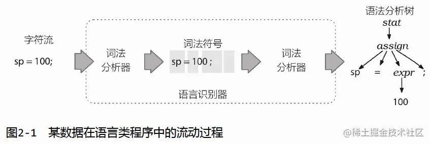 默认情况下,ANTLR生成的语法分析器会建造一种名为语法分析树(parse tree)或者句法树(syntax tree)的数据结构, 该数据结构记录了语法分析器识别出输入语句结构的过程,以及该结构的各组成部分。下图展示了数据在一个语言类应用程序中的基本流动过程。